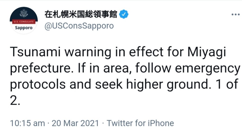 Japanese authorities issued a tsunami alert after a 7.2-magnitude earthquake struck Japan, off the coast of Miyagi. It has been reported that a one metre tsunami hit Japan a few moments ago local television channel NHK reported.