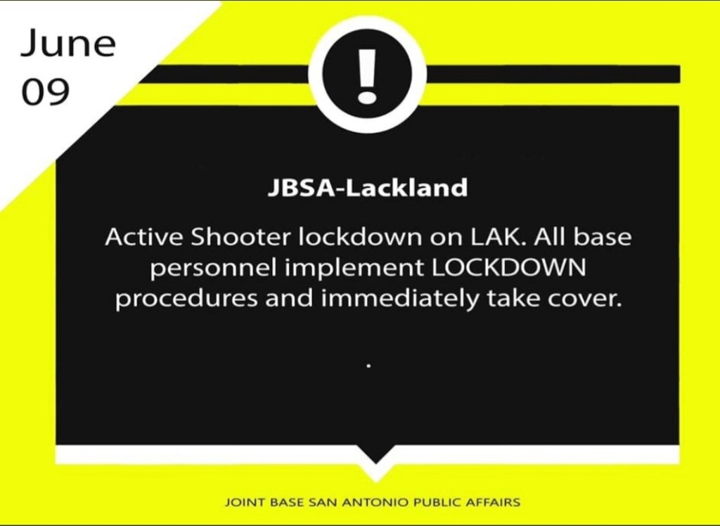 An active shooter warning was reported at the Joint Base San Antonio, Texas a few minutes ago. The alert said, ‘Active Shooter lockdown on LAK.’