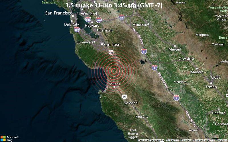 An hour ago, a 3.5-magnitude earthquake struck 5.3 miles east of Watsonville, Santa Cruz County, California at a very shallow depth of 4.7 miles.