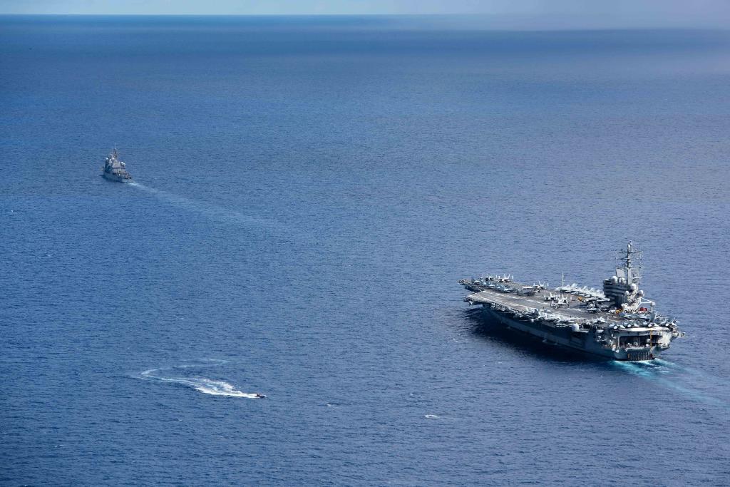 While in the South China Sea, the carrier-led strike group is conducting maritime security operations. These include flight operations with rotary and fixed wing aircraft, maritime strike exercises, and also coordinated tactical training between surface and air units.