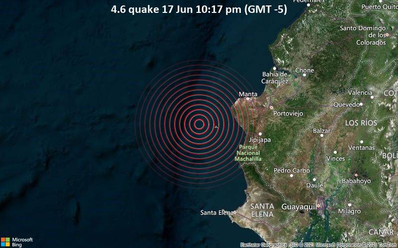 Hours ago, the Institute of Geophysics of the National Polytechnic School in Quito (IGEPN) reported a 4.6-magnitude 92km southwest of Portoviejo, Ecuadot. It was later revised to a 4.5-magnitude, at a shallow depth of 5km. The European-Mediterranean Seismological Centre (EMSC) reported the quake at a 4.6-magnitude with a very shallow depth of 0km.
