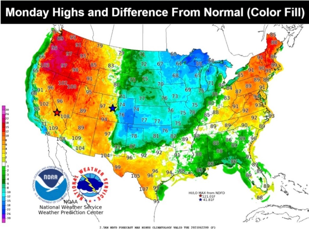 According to the National Weather Service (NWS) Weather Prediction Service predicts an unseasonably strong cold front across the whole US over the next few days. Temperatures are expected to drop by 15 to 20 degrees Fahrenheit. Highs in the central plains are expected to drop from 100+ to 70s from Sunday to Monday, while in the Northeast temperatures will drop from 90 to 70°F.