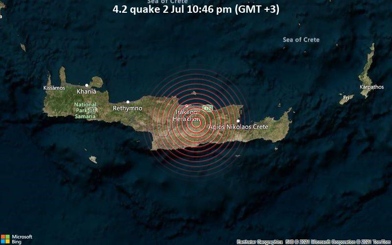 Moments ago, the National Observatory of Athens (NOA) reported a 4.2-magnitude earthquake 19 km southeast of Iraklion, Heraklion Regional Unit, Crete, Greece at a shallow depth of 14.1km.