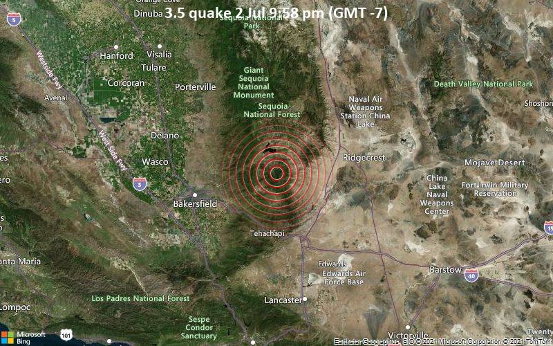 Ten minutes ago, USGS reported a 3.5-magnitude earthquake 38 miles east of Bakersfield, Kern County, California, USA at a shallow depth of 4.4km. The nearest volcano is 76km away.