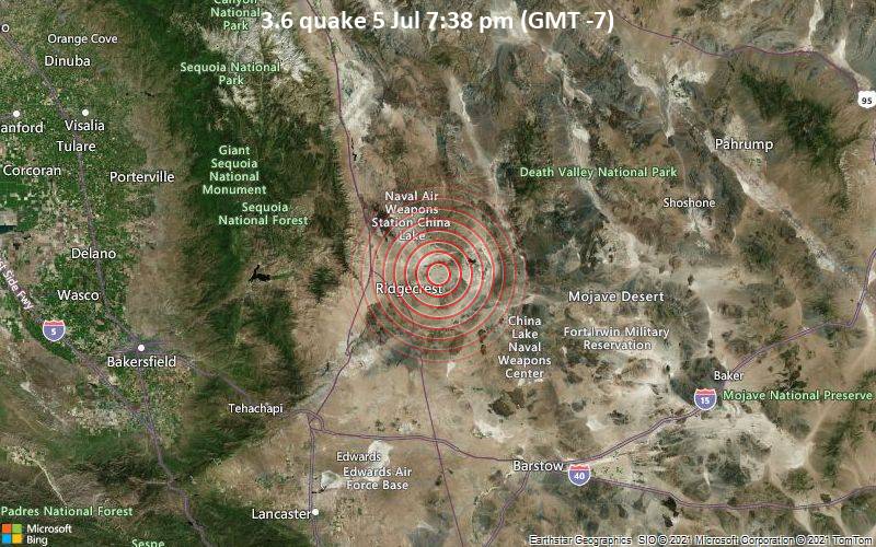An hour ago a 3.6-magnitude earthquake struck San Bernardino County, 8.8 mi northeast of Ridgecrest, Kern County, California, USA at a shallow depth of 5.9km.
