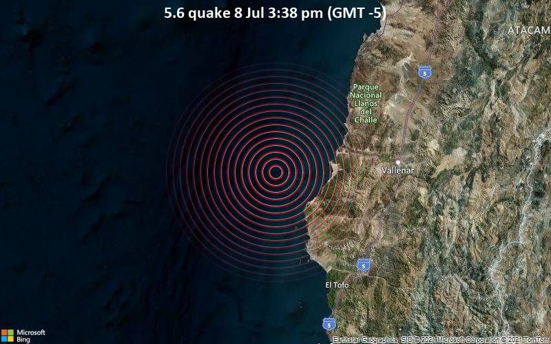 Minutes ago a 5.7-magnitude earthquake struck the South Pacific Ocean, 109 km west of Vallenar, Provincia de Huasco, Atacama, Chile at 3.38pm local time. The quake occurred at a shallow depth of 10km.
