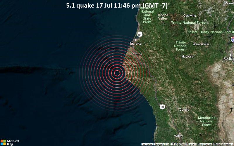 Minutes ago USGS reported that a 5.1-magnitude earthquake struck North Pacific Ocean, 38 mi southwest of Eureka, Humboldt County, California, USA at a depth of 27km.
