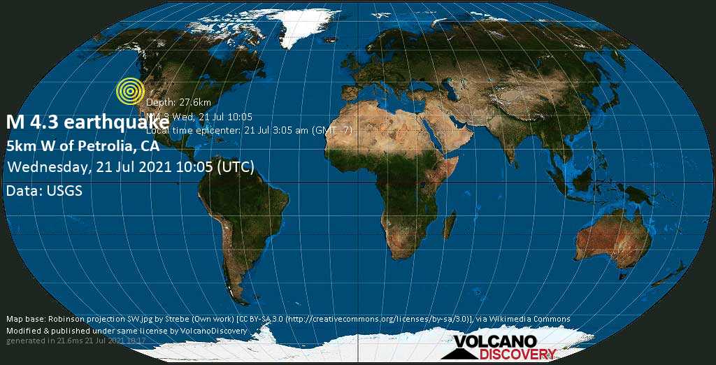 Moments ago USGS reported that a 4.3-magnitude earthquake struck 34 miles south of Eureka, Humboldt County, California, USA at a depth of 27.6km.
