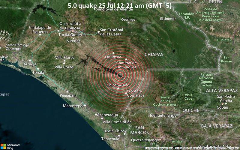 An hour ago the German Research Centre for Geosciences (GFZ) reported that a 5.0-magnitude earthquake struck San Nicolás, 72 km southwest of Comitan, Chiapas, Mexico at a depth of 214km.