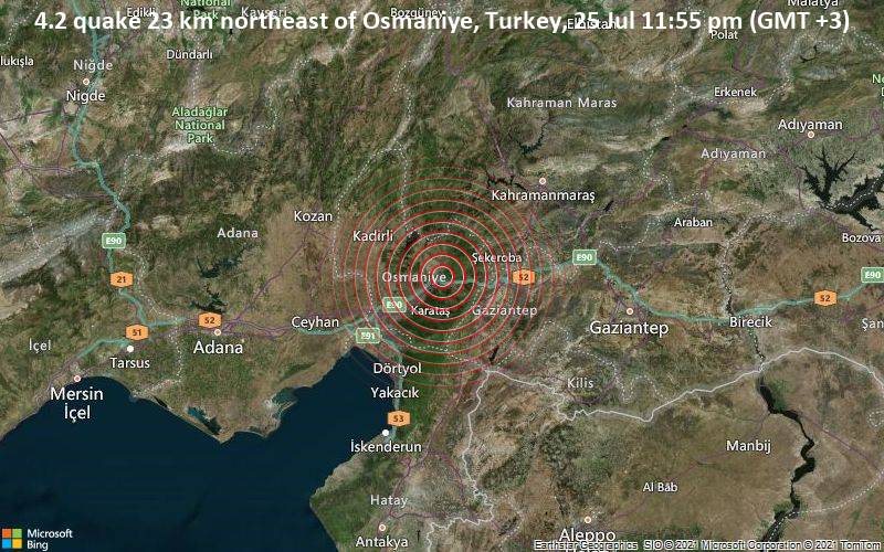 An hour ago the European-Mediterranean Seismological Centre (EMSC) reported a 4.2-magnitude earthquake 23 km northeast of Osmaniye, Turkey at a shallow depth of 7km. The National Observatory of Athens (NOA) agency and Kandilli Oservatory and Earthquake Research Institute in Istanbul (KOERI-RETMC) listed the quake at a 4.0 and 4.3-magnitude respectively.