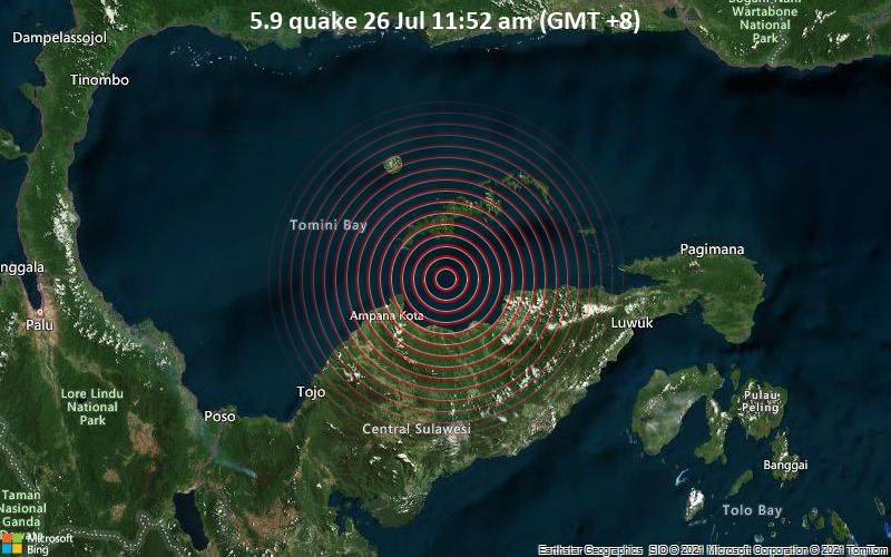 An hour ago a strong 5.8-magnitude earthquake struck Minahassa Peninsula, Sulawesi, Indonesia at a shallow depth of 10km.
