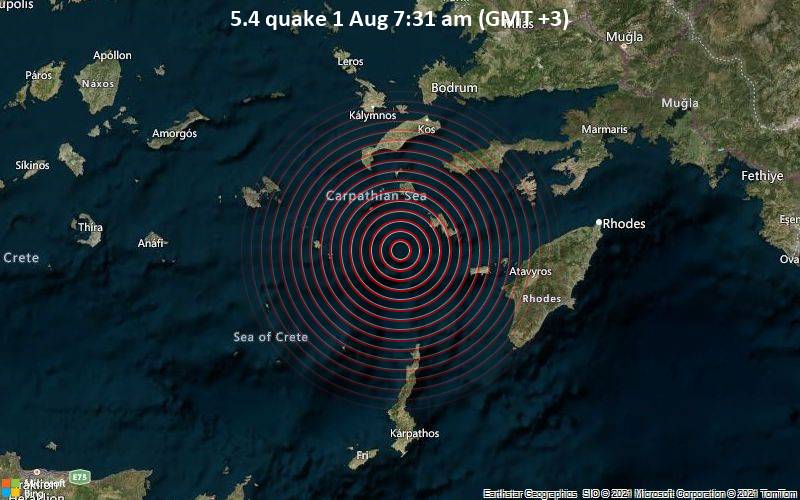 Moments ago the National Observatory of Athens (NOA) reported that a 5.4-magnitude earthquake struck the Aegean Sea, 58 km south of Kos, Dodecanese, South Aegean, Greece at around 7.31am (GMT+3). The earthquake was located at a very shallow depth of 15.6km.