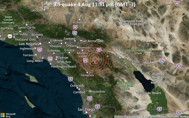 Towns or cities that might have felt a weak shaking include Hemet (pop. 83,900) located 1 miles from the epicenter, San Jacinto (pop. 47,000) 2 miles away, East Hemet (pop. 17,400) 3 miles away, Menifee (pop. 87,200) 10 miles away, Beaumont (pop. 43,800) 12 miles away, Perris (pop. 75,000) 14 miles away, Moreno Valley (pop. 204,200) 19 miles away, and Murrieta (pop. 109,800) 19 miles away.
