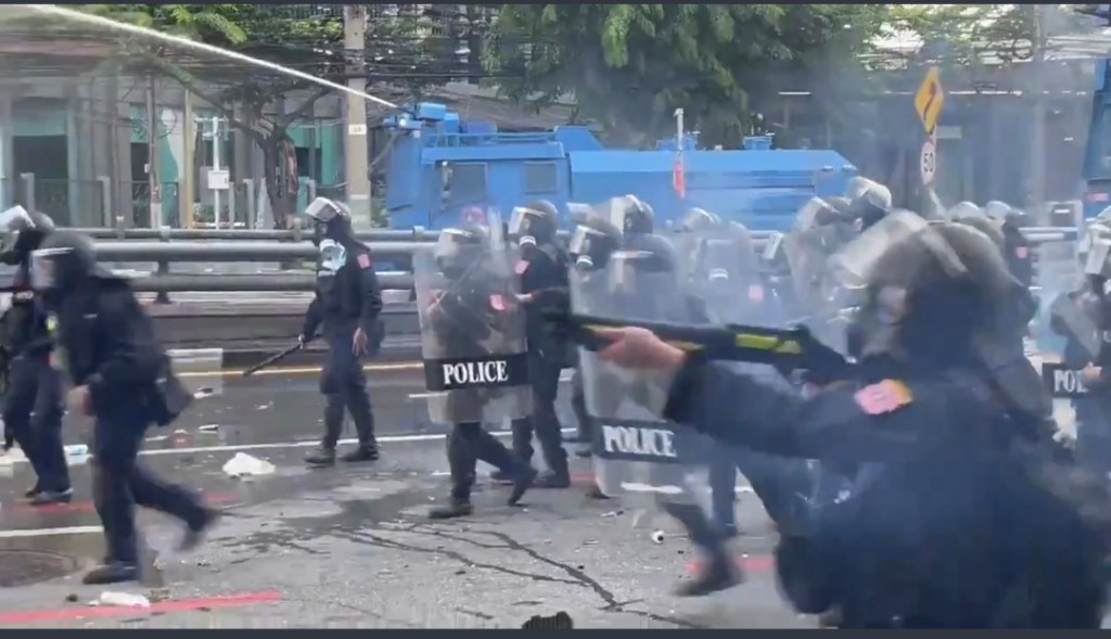 The police sealed a road close to the victory monument and are pushing the protestors back using rubber bullets and tear gas. Hundreds of riot police fully armed with the required gear were seen close to where the protestors were.
