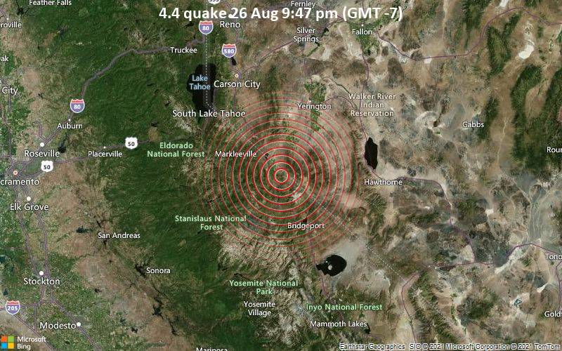 Two hours ago the United States Geological Survey (USGS) reported that a 4.4-magnitude earthquake struck Mono County, 40 miles southeast of South Lake Tahoe, El Dorado County, California, USA at a very shallow depth of 0.9km. The European-Mediterranean Seismological Centre (EMSC) also reported the earthquake at a 4.4-magnitude.