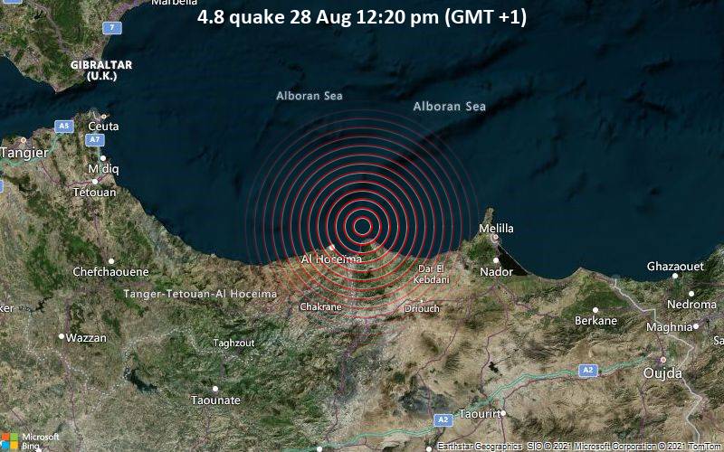 Nearly an hour ago the European-Mediterranean Seismological Centre (EMSC) reported that a 5.1-magnitude earthquake struck the Alboran Sea, 36 km northeast of Al Hoceima, Morocco at a shallow depth of 10km. The the German Research Centre for Geosciences (GFZ) reported the quake at 4.2-magnitude.