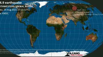Image Credit: VolcanoDiscovery Hours ago the Kazakhstan National Data Centre (KNDC) reported a 4.9-magnitude earthquake 140 km west of Lesosibirsk, Krasnoyarskiy Kray, Russia at a shallow depth of 10km. The […]