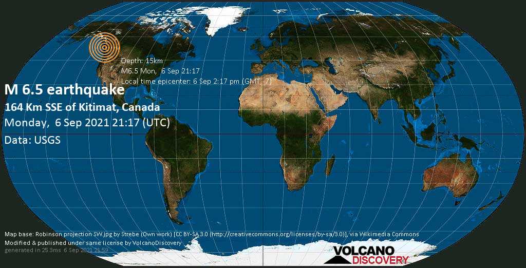 Minutes ago the United States Geological Survey (USGS) reported that a 6.5-magnitude earthquake struck 211 km south of Terrace, Regional District of Kitimat-Stikine, British Columbia, Canada at a depth of 15km.