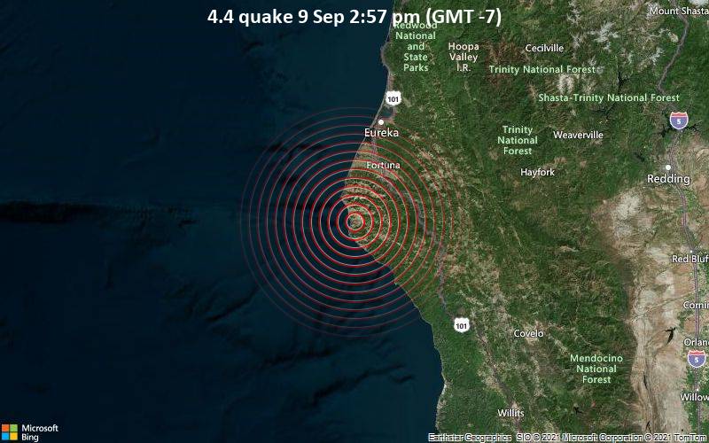 The moederate earthquake was most likely felt by a number of people residing close to the epicenter. Towns or cities where a light shaking might have been felt include Scotia (pop. 850) located 16 miles from the epicenter, Rio Dell (pop. 3,400) 17 miles away, Fortuna (pop. 12,000) 21 miles away, and Humboldt Hill (pop. 3,400) 29 miles away, Eureka (pop. 27,000) located 34 miles from the epicenter, Bayside (pop. 17,100) 39 miles away, Arcata (pop. 17,800) 40 miles away, and McKinleyville (pop. 15,200) 45 miles away.