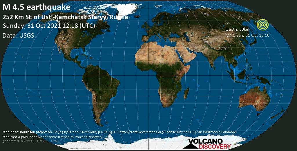 Moments ago the United States Geological Survey (USGS) reported that a 4.5-magnitude earthquake struck 252 Km southeast of Ust’-Kamchatsk Staryy, Russia at a depth of 38km.