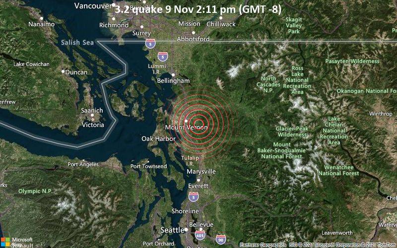 Minutes ago the USGS reported a 3.2-magnitude earthquake near Mount Vernon, Skagit County, Washington State, USA at a depth of 15km. The light earthquake occured at 2.11pm local time.