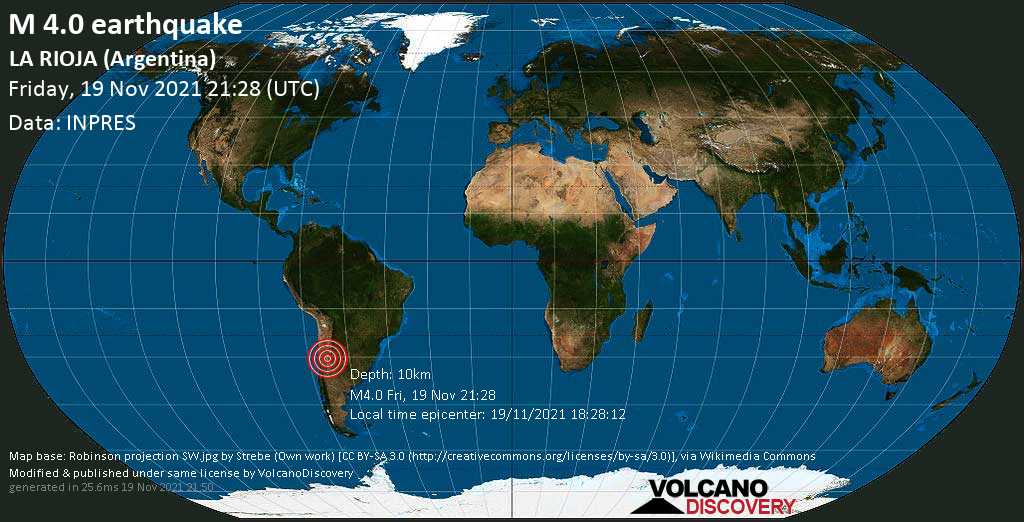 A 4.0-magnitude earthquake just struck Departamento de Independencia, La Rioja, 39 km north of San Agustin de Valle Fértil, Departamento de Valle Fértil, San Juan, Argentina at a shallow depth of 10km according to Instituto Nacional De Prevencion Sismica (INPRES).
