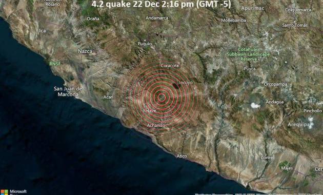 A 4.2-magnitude earthquake strikes Southern Peru. Image Credit: Earthstar Geographics Minutes ago a 4.2-magnitude earthquake struck 47 km south of Coracora, Provincia de Parinacochas, Ayacucho, Peru at a depth of 105km. The exact magnitude, epicenter, and […] truthisacommodity December 22, 2021 Leave a Comment