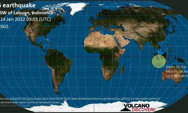 A 6.6-magnitude earthquake hits Indonesia. Image Credit: VolcanoDiscovery A very strong 6.6-magnitude earthquake struck the Indian Ocean, 193 km southwest of Jakarta, Indonesia at a depth of 37.2km. The exact magnitude, epicenter, and depth of […] truthisacommodity January 14, 2022 Leave a Comment