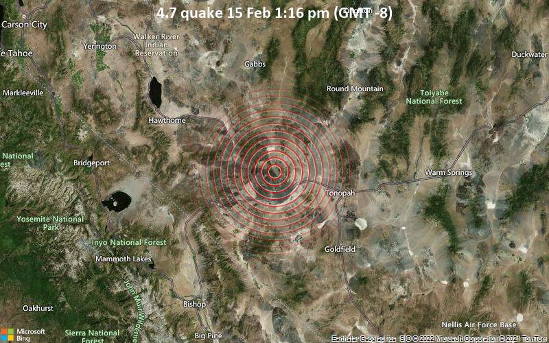 A 4.7-magnitude earthquake struck 31 miles west of Tonopah, Nye County, Nevada, USA at a shallow depth of 4.1km.