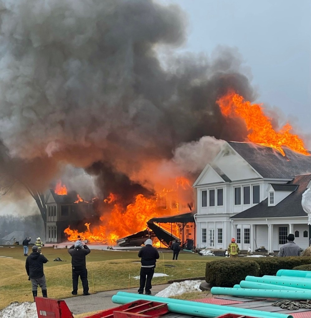 The flames seem to have started around 10am, when it started from the roof of the private clubhouse as thick black smoke billowed from the building. Unfortunately, the fire spread rapidly to engulf the whole Country Club. The roof has since collapsed and the central part of the building has been essentially destroyed. More details to follow.