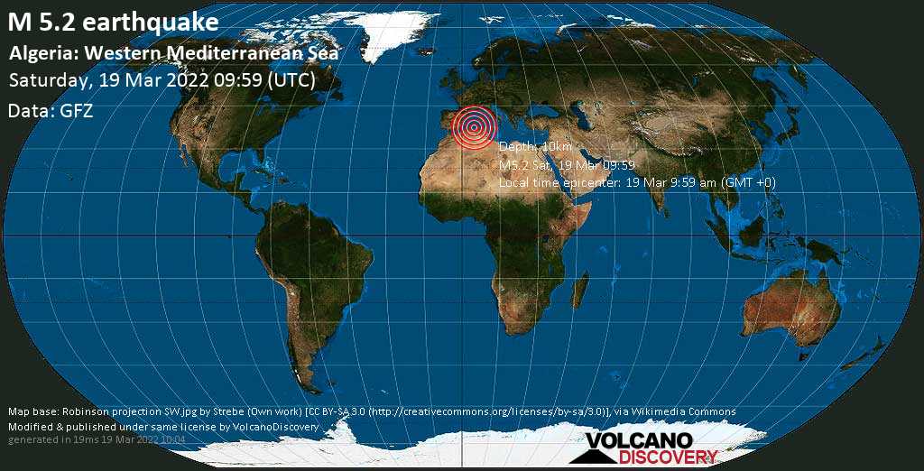 The German Research Centre for Geosciences (GFZ) just reported a 5.2-magnitude earthquake in Western Mediterranean Sea, Algeria at a shallow depth of 10km.