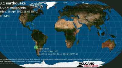 Image Credit: VolcanoDiscovery Minutes ago a 3.1-magnitude earthquake struck 116 km west of Ciudad de San Juan, Departamento de Capital, San Juan, Argentina at a depth of 83km. The exact […]