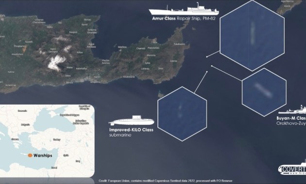 Russian Navy submarine and warships spotted off the coast of Crete. Image Credit: Twitter Account @CovertShores According to Open Source Intelligence, on Saturday, a Russian Navy Kilo Class submarine was spotted by a Copernicus Sentinel satellite in the Mediterranean Sea close […] truthisacommodity April 2, 2022 1 Comment