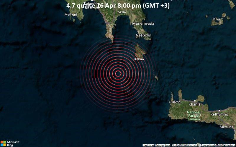 Minutes ago a 4.7-magnitude earthquake struck the Ionian Sea, 92 km south of Gythio, Laconia, Peloponnese, Greece at a depth of 64.6km