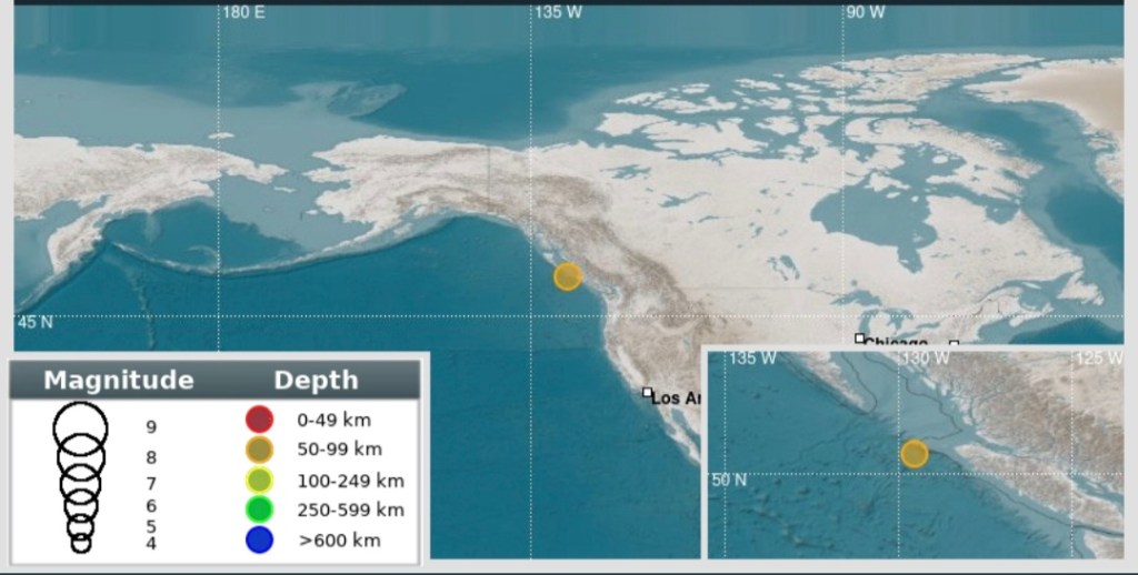 Minutes ago a 5.0-magnitude earthquake struck 170 Km W of Port McNeill, Canada at a depth of 52km.