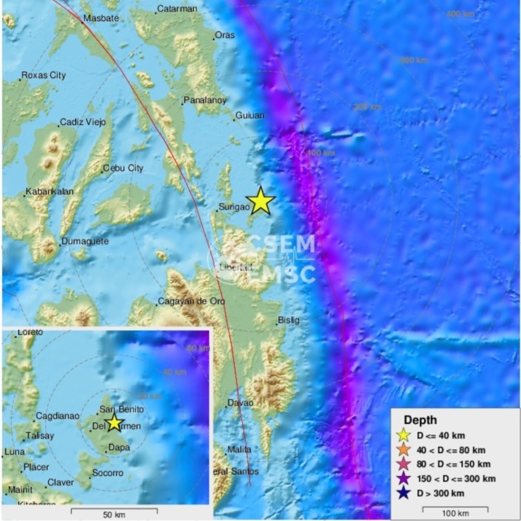 Weak shaking was most likely felt in Socorro (pop. 9,700) located 35 km from the epicenter, Surigao City (pop. 87,800) 68 km away, and Tandag (pop. 29,000) 93 km away.