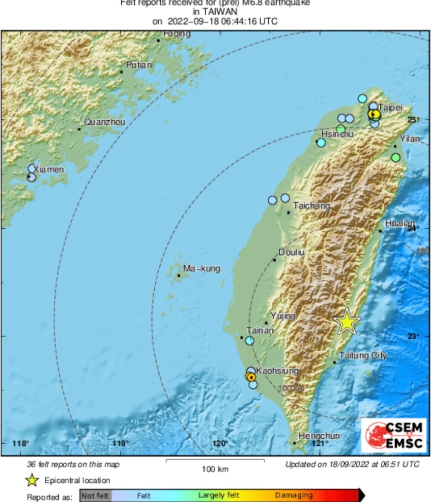 Taiwan has just been hit by a 6.8-magnitude earthquake at a depth of less than 10km. It struck 85km east of Yujing, Taiwan.