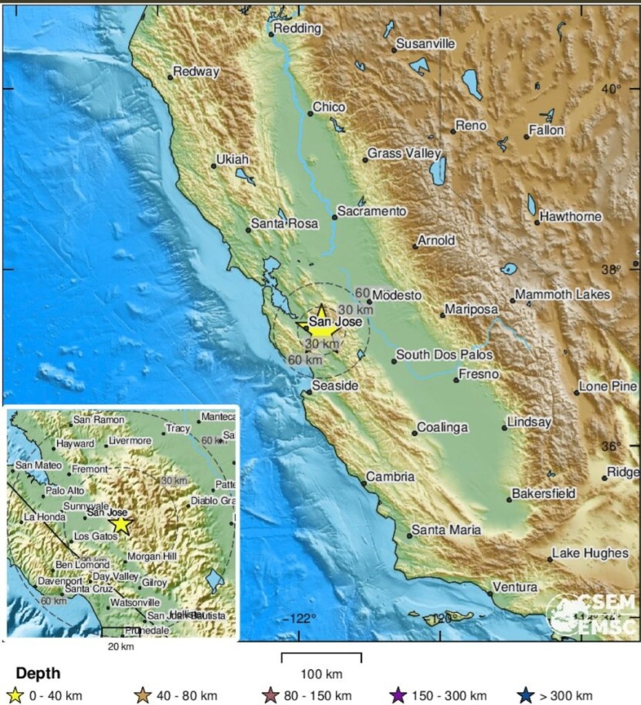 Minutes ago a a 5.1-earthquake struck 12 miles east of San Jose, Santa Clara County, California, USA at a shallow depth of 6.9km.
