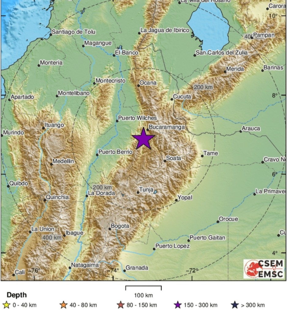 Minutes ago a 5.6-magnitude earthquake struck 21km southeast of Bucaramanga in Northern Colombia at a depth of 145km.
