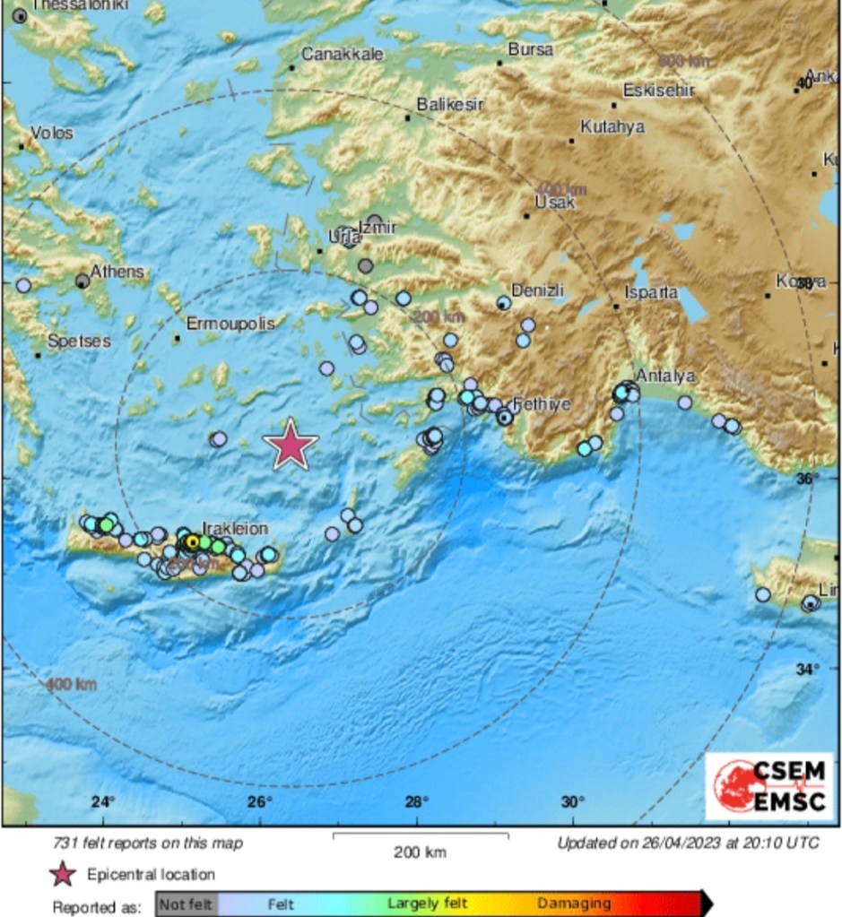 Nearly half an hour ago a 5.2-magnitude earthquake struck the Aegean Sea, 158 km northeast of Heraklion, Crete, Greece at a depth of 108.4km.