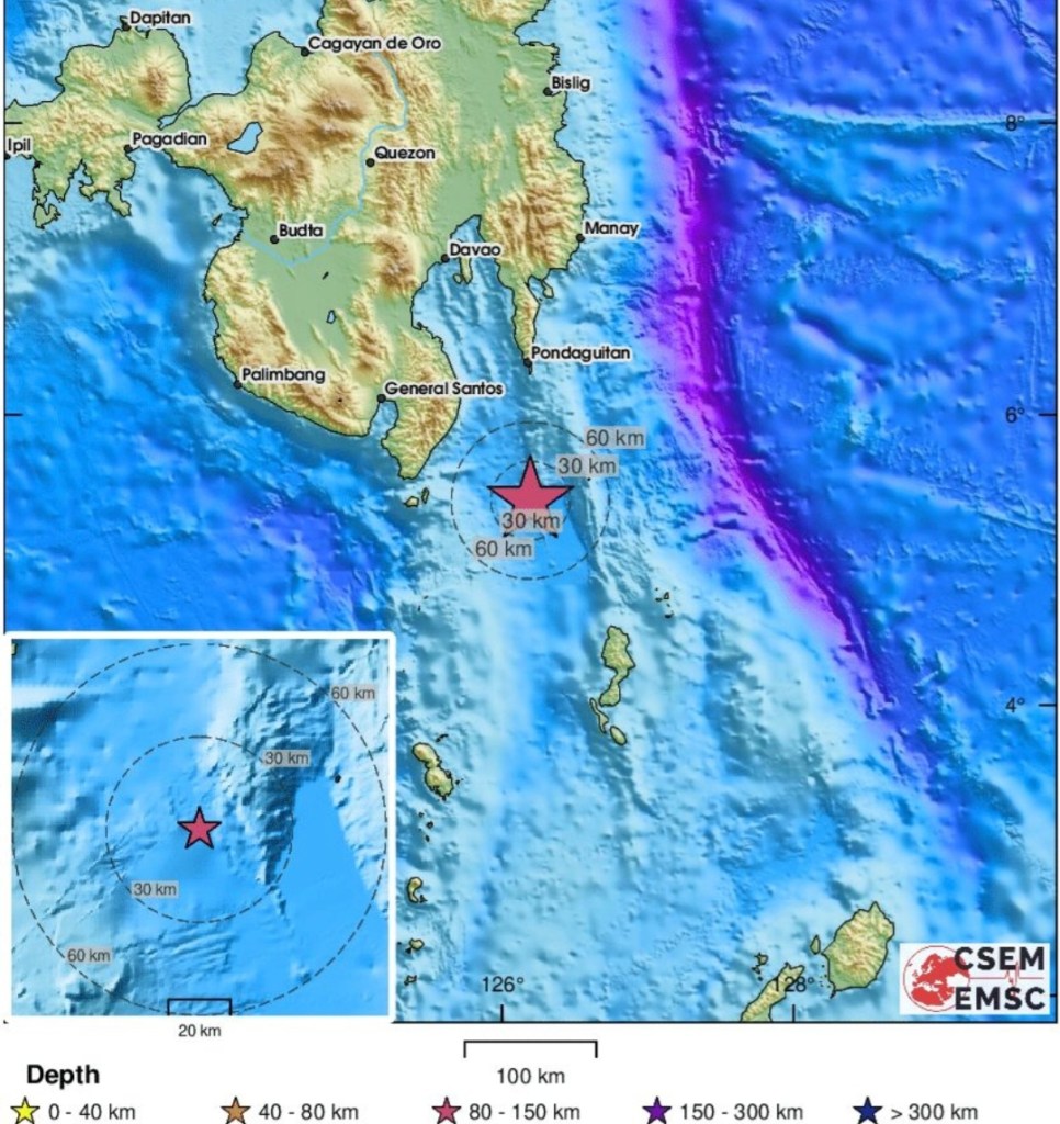 Moments ago a 6.6-magnitude earthquake struck the Philippine Sea, 130 km southeast of General Santos City, Philippines at a depth of 121.7km.