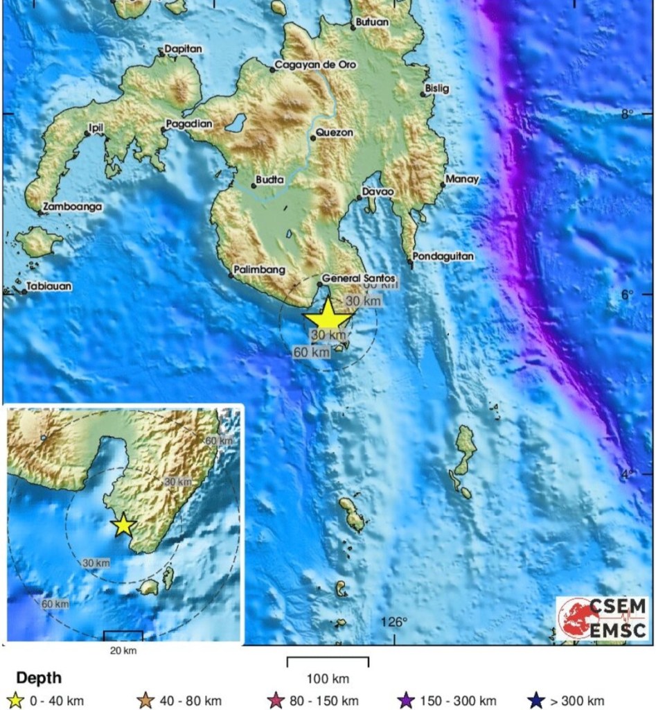 Moderate shaking probably occurred in Malapatan (pop. 19,400) located 38 km from the epicenter, Alabel (pop. 43,300) 53 km away, General Santos City (pop. 679,600) 55 km away, Polomolok (pop. 64,000) 69 km away, Maluñgun (pop. 52,200) 72 km away, and Malita (pop. 41,100) 96 km away.