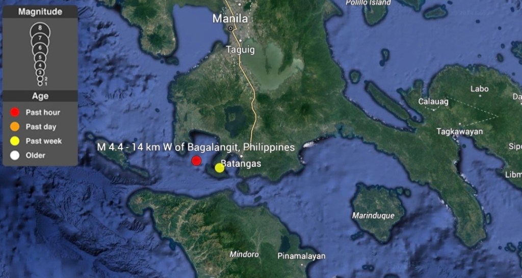 Nearly an hour ago at 3.33am local time, a 4.4-magnitude earthquake struck the South China Sea, 33 km west of Batangas, Calabarzon, Philippines at a depth of 191km.