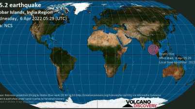 Image Credit: VolcanoDiscovery An hour ago a 5.2-magnitude earthquake struck Andaman Sea and Nicobar Islands, India, 243 km northwest of Banda Aceh, Indonesia at a depth of 0km. The exact […]